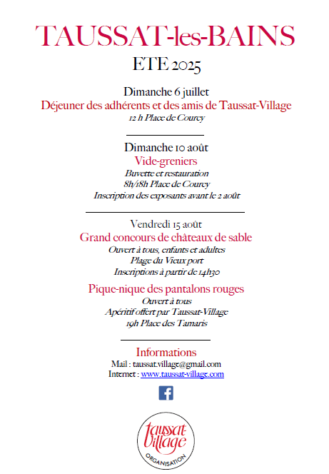 Les traditions festives du 15 août de Taussat-Village ont connu cette année encore un beau succès : une centaine de participants au dîner pique-nique des « pantalons rouges » particulièrement réussi, face au superbe coucher de soleil après le concours des châteaux de sable de l’après-midi qui a mobilisé bien des talents justement médaillés. Le vide-greniers du 18 a confirmé être devenu un rendez-vous désormais incontournable de l’été, entrainé par le succès de celui du mois de mai qui a lancé notre saison, précédant le concert de harpe donné le 24 par Catherine Baudichet à la chapelle de Taussat. Un regret : avoir dû renoncer au repas annuel de nos adhérents prévu le 7 juillet…